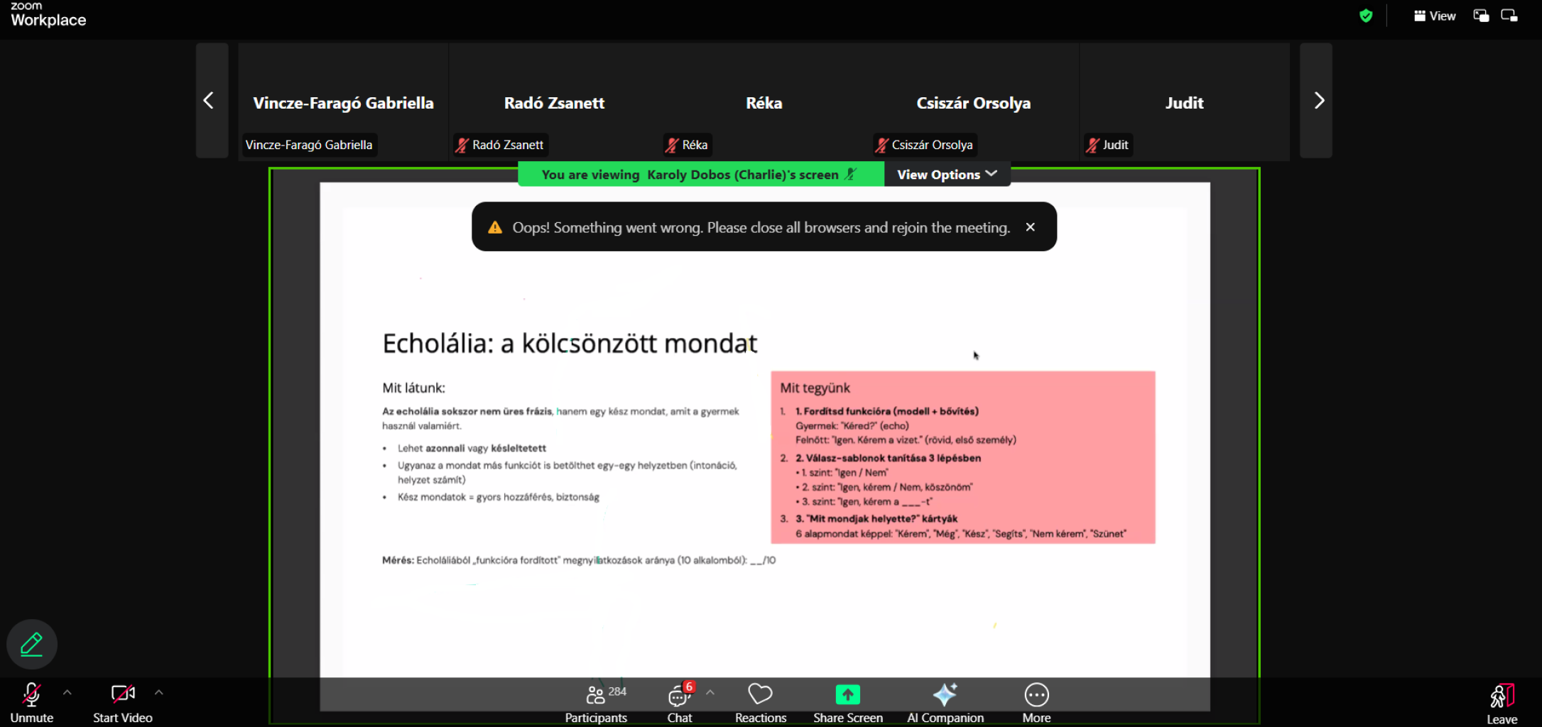 Az előadótól azt is megtudtuk, hogy mutatkozik meg az echolálás által az autista gyermek nyelvi ösztöne. Az echolálás mások beszédének visszhangszerű utánzását jelenti (a gyerek úgy rögzíti a hallottakat, akár egy magnó). A beszéd ilyenkor megjelenik, de funkcióját nem látja el. Például megismétli a Hogy hívnak? kérdést, de válasz nem érkezik.