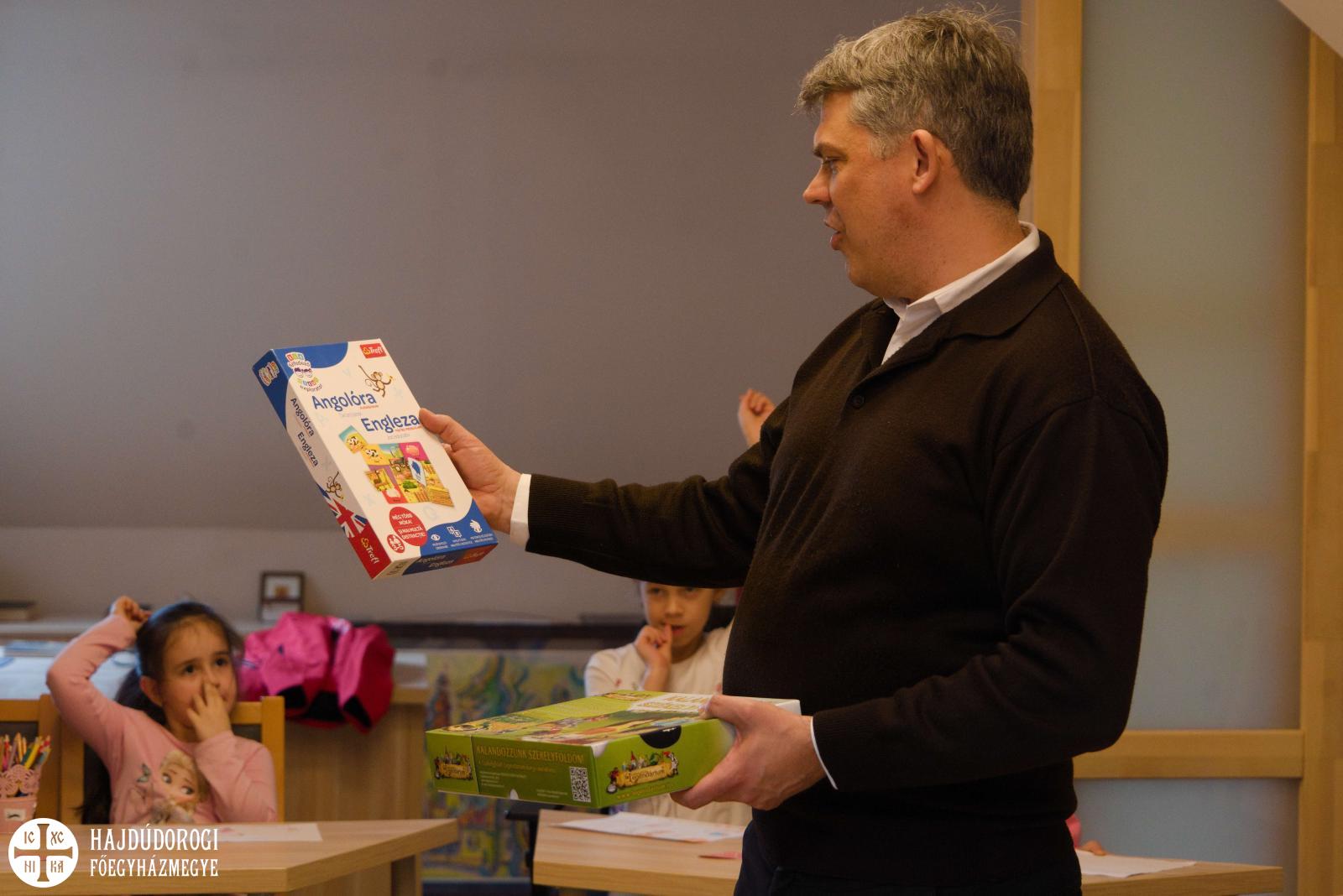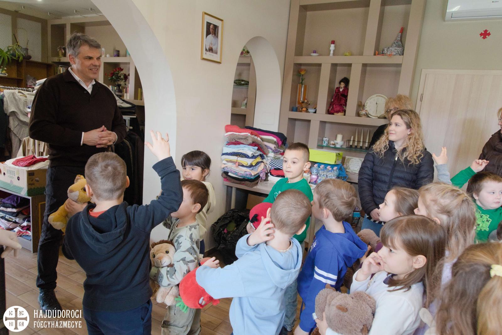 Délelőtt Vígkedvű Mihály utcai görögkatolikus óvodánkból érkezett két csoport, összesen harminc gyermek a szolgáltatópontra. Az ovisokat Jaczkó Dániel, a főegyházmegyei karitász vezetője köszöntötte, röviden összefoglalva a szolgáltatópont munkáját. Elmondta, hogy ezen a helyen ruhaneművel és lábbelivel is tudnak segíteni a rászorulóknak és gyerekeiknek.