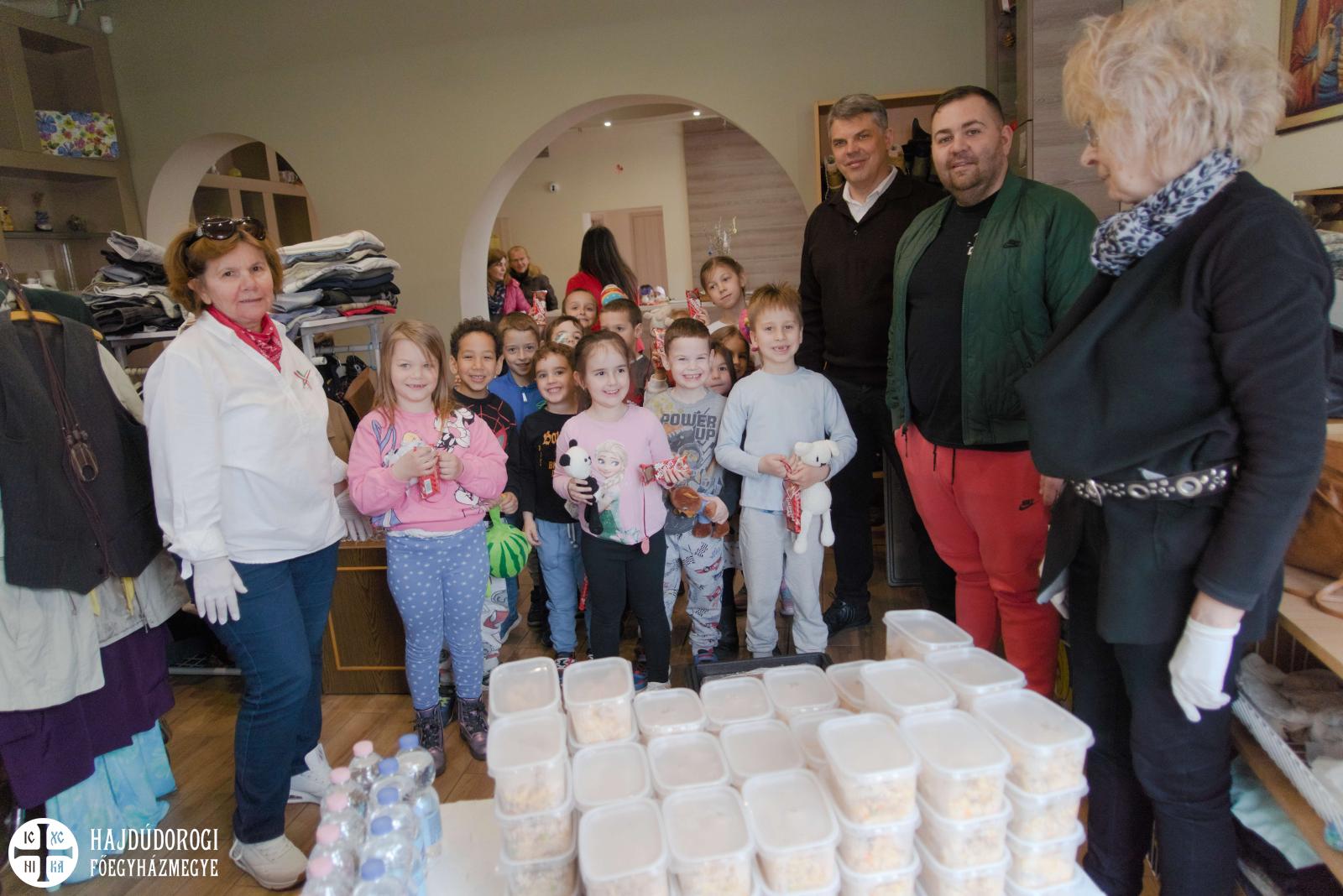 Az étel, a víz és a szórólap kiosztásában a Katica és a Maci csoport óvodásai is segítettek. A szolgáltatópont munkájáról és feladatairól Jaczkó Dániel atya, a főegyházmegyei karitász vezetője mesélt a gyerekeknek, hangsúlyozva, milyen fontos, hogy segítségére legyünk azoknak, akiknek nem telik ételre, italra, megfelelő ruházatra. Papp Anita, a szolgáltatópont munkatársa pedig egy rövid mesével szemléltette, hogyan segíthetünk másoknak kinőtt ruhadarabjaink elajándékozásával.